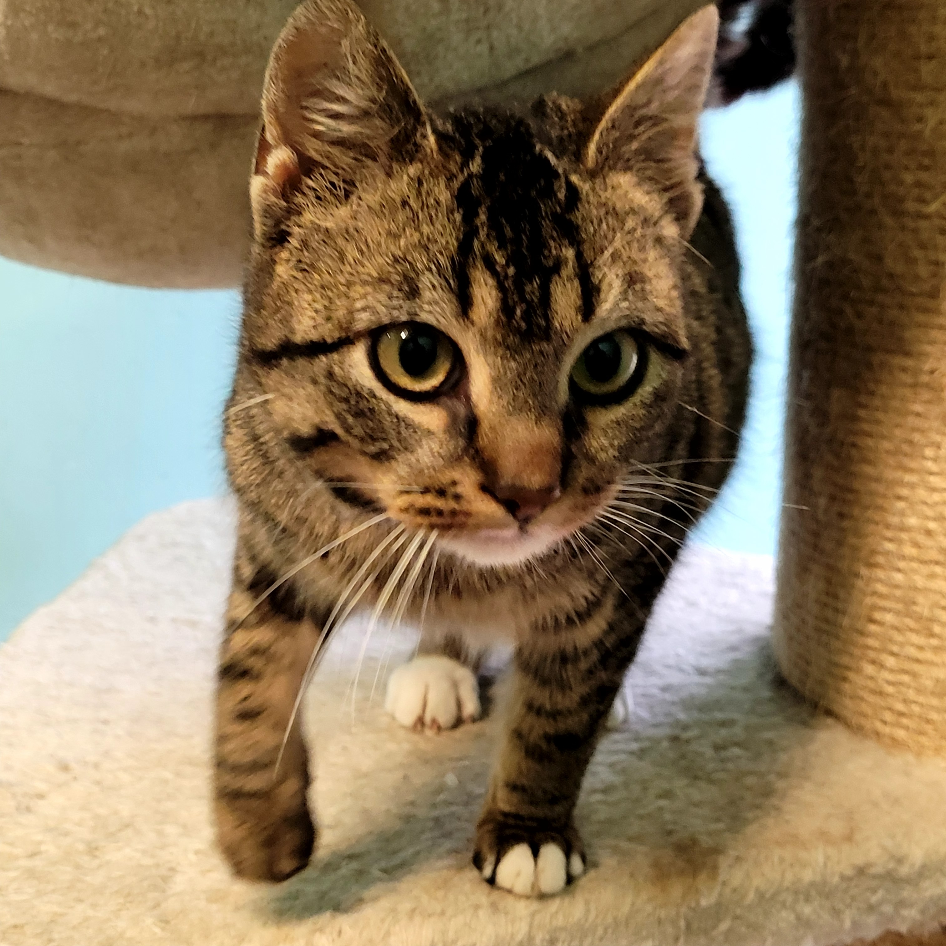 Die knapp ein jährige Katze ist neugierig und verspielt. Sie ist noch recht schüchtern, aber das legt sich meistens recht schnell.